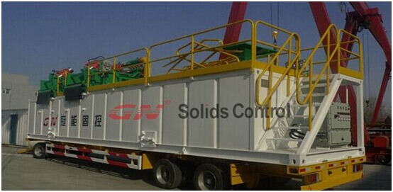 冠能150GPM泥漿系統(tǒng)配置如下 1、1臺(tái)GNZS703D雙層振動(dòng)篩上安裝了3個(gè)4寸除泥旋流器,通過(guò)GNZS703D雙層篩可以把粗砂除去,然后通過(guò)除泥旋流器把20um左右以上的顆粒在分離除去, 2、2臺(tái)GNSB4X3-12J的砂泵安裝在泥漿罐斜倉(cāng)上,1臺(tái)用于給除泥器供漿,另外1臺(tái)作為混漿泵使用。 3、4米長(zhǎng)的泥漿罐,非常緊湊的設(shè)計(jì)跟合理的布局,對(duì)于狹小的鉆井空間非常適宜。
